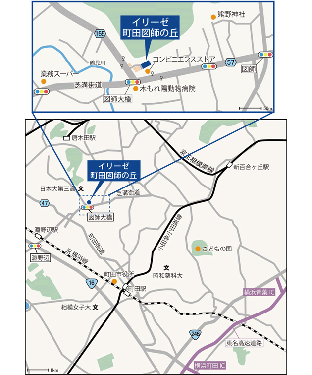 小田急小田原線「町田」駅よりバス約15分町田バスセンター乗り場より「野津田車庫行」「多摩丘陵病院行(図師経由)」「小山田行(図師大橋経由)」「鶴川駅行(図師・五反田経由)」いずれか利用「図師大橋」停留所下車徒歩1分(約200m)